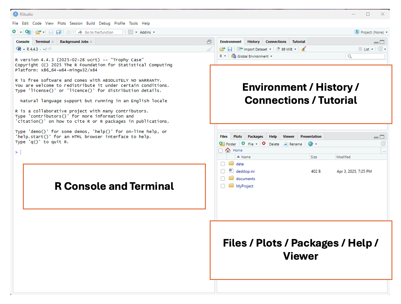 When we launch RStudio for the first time, we notice three main panels or quadrants: