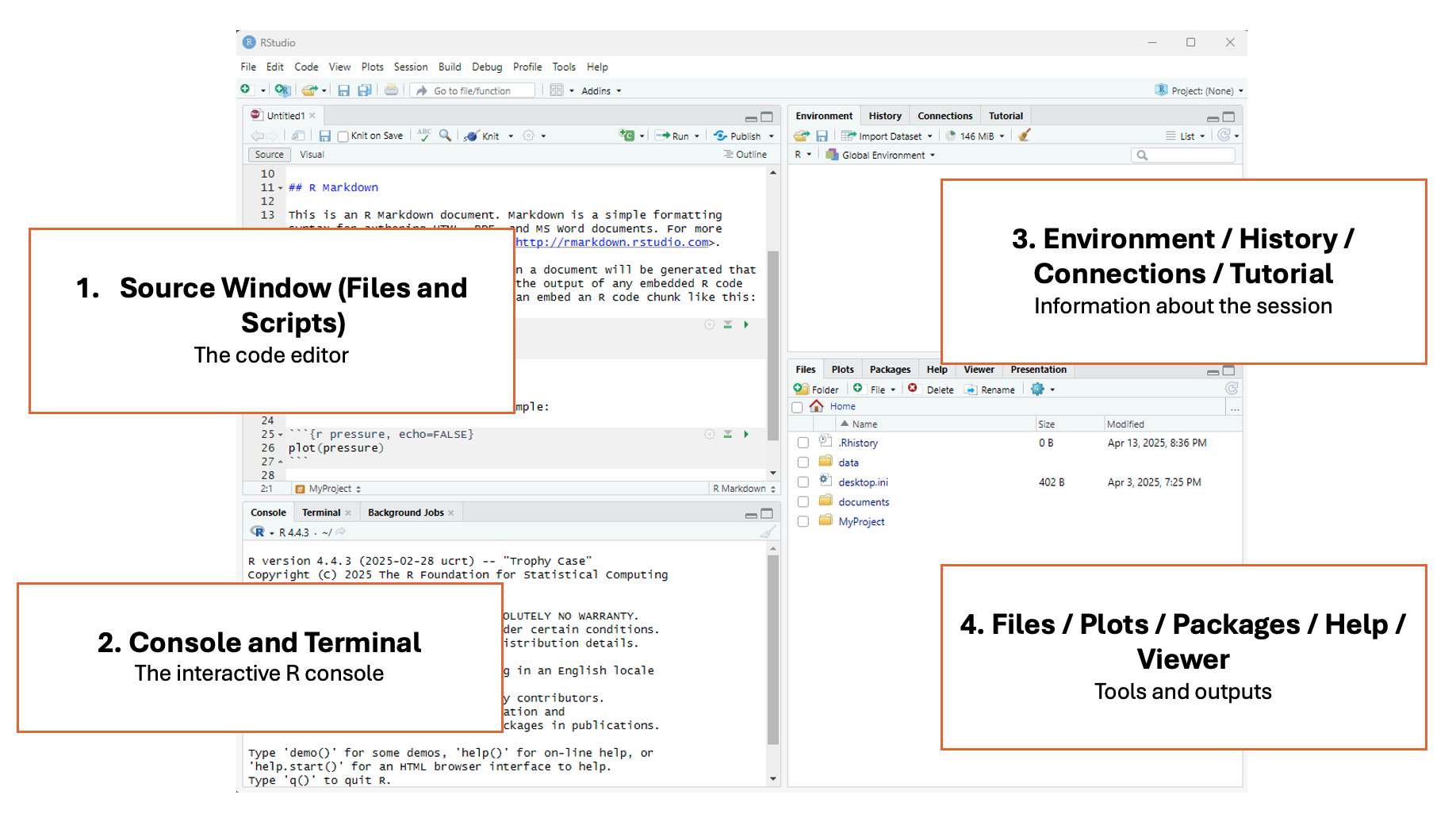 This is your code editor, where you write, save, and run R scripts (.R), RMarkdown documents (.Rmd), or other file types.