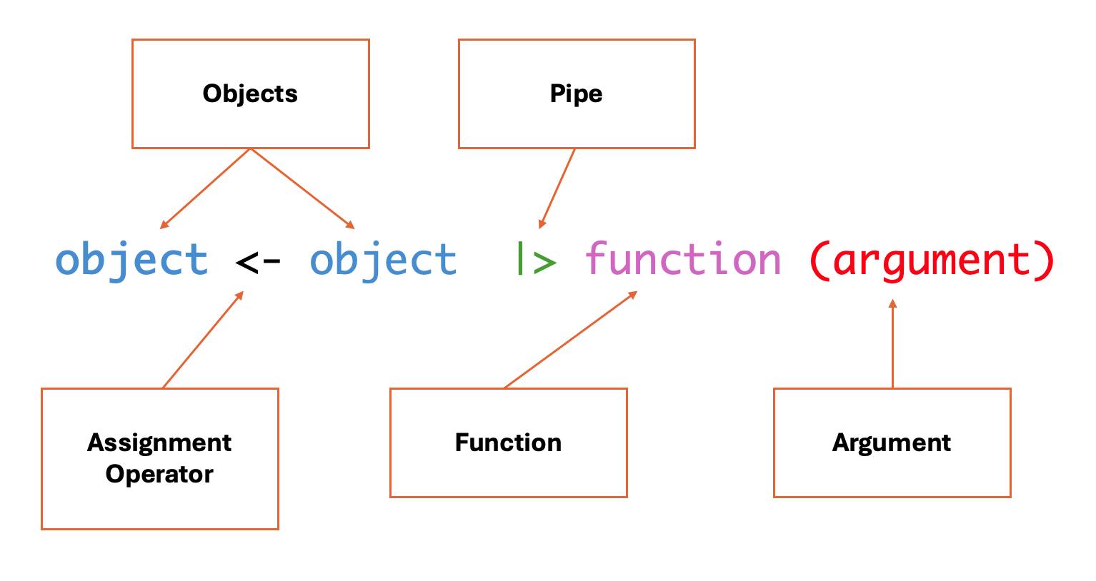 Assignment operators, pipes and arguments are used to link objects and functions and communicate what we want to do.