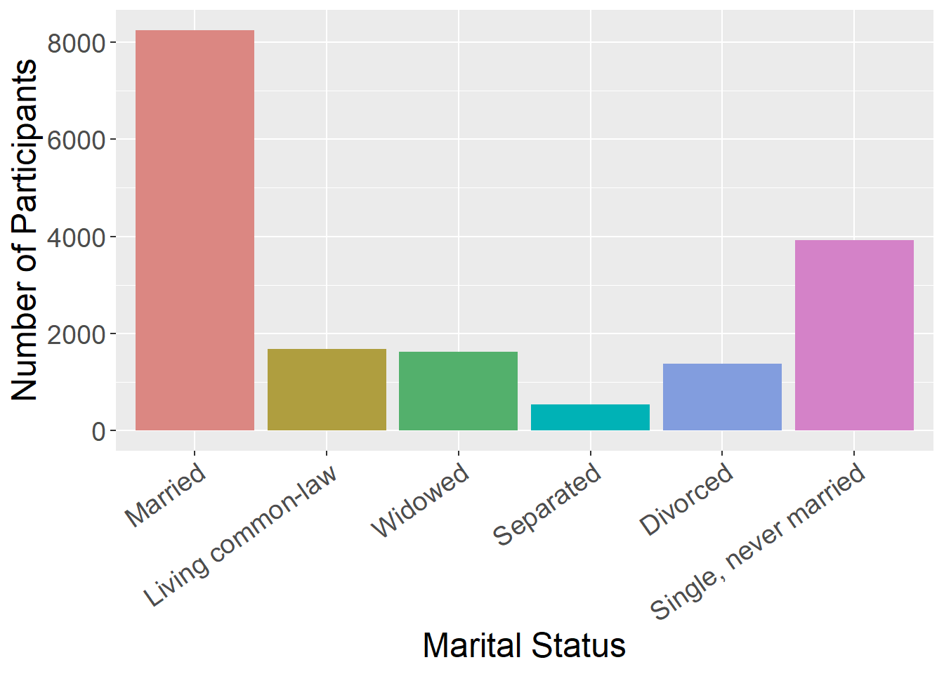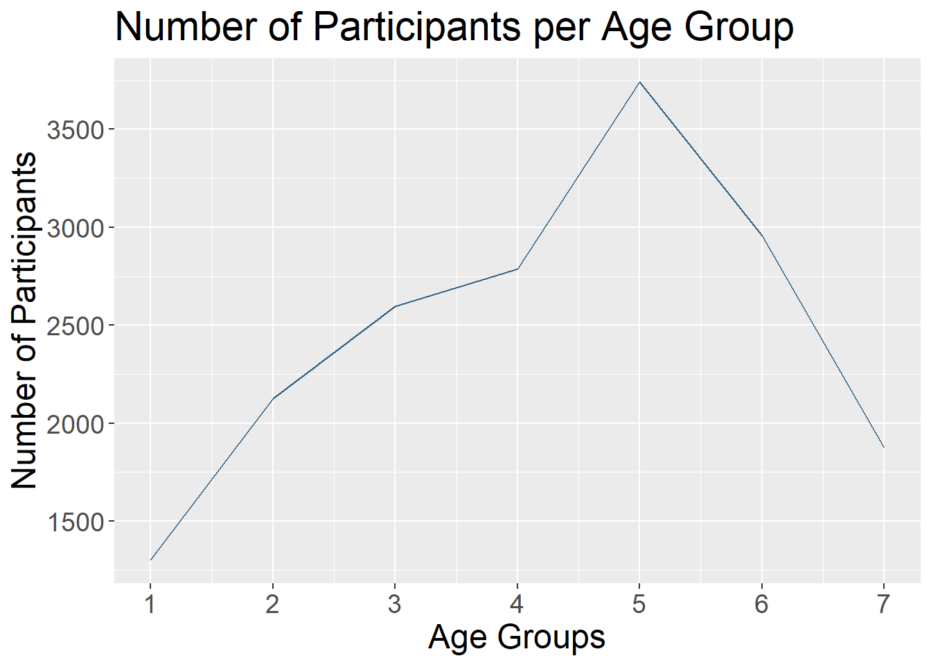Line charts use connected straight lines to display data. They are good for showing change over time on a continuous variable. They are often similar in purpose to bar charts, but visually simpler if there are many time points. An example of where we often see line charts used in the news is to visualize the stock market. (Plotting the various age groups here is not particularly meaningful since this data was only collected at one time point, but is used to illustrate this type of data visualization.)
